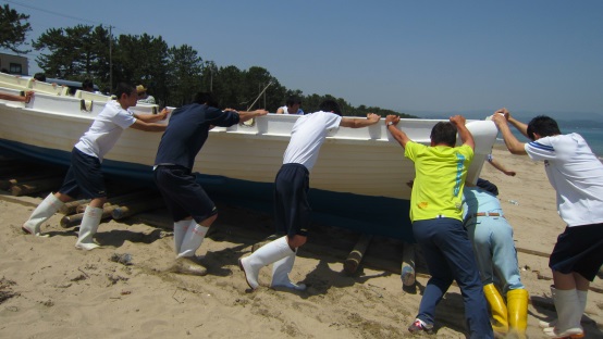 島尾海岸にて、海洋科学科の3年生19名がカッターボートを艇庫から海に運び出す艇庫開きを行った。