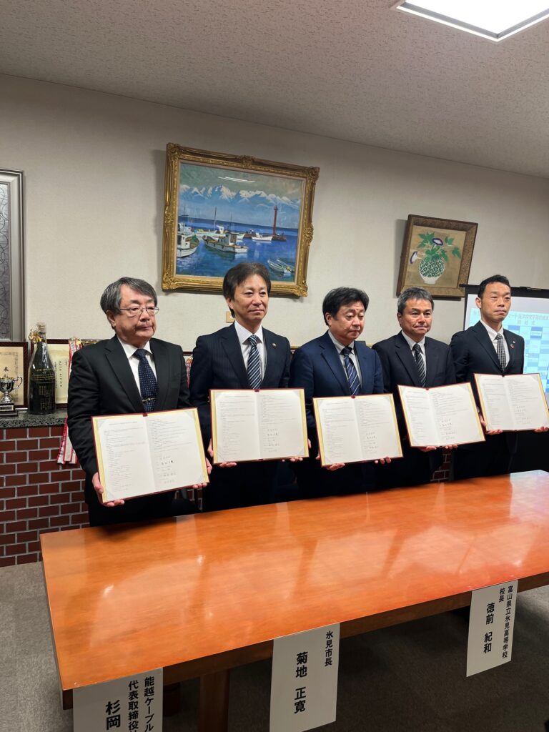 4月16日(木)、本校は氷見市、塩出教授(東京海洋大学)、能越ケーブルネット、NTT西日本富山支店の4者とスマート海洋探究学習の推進に関する連携協定を結びました。