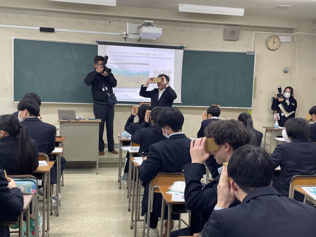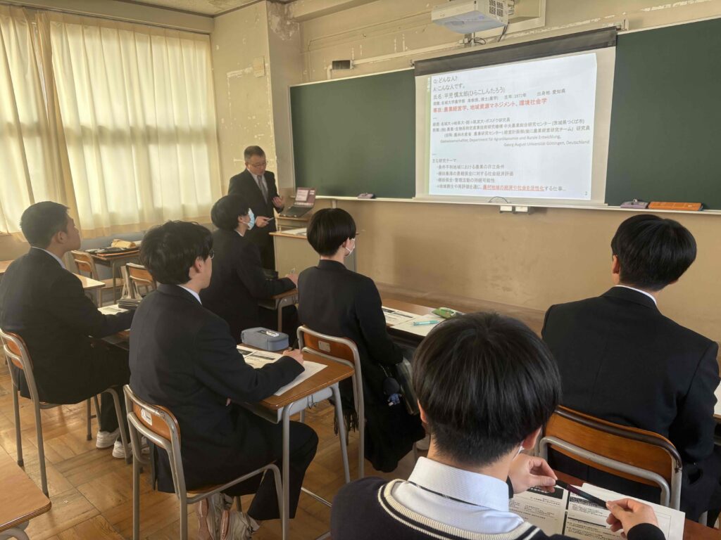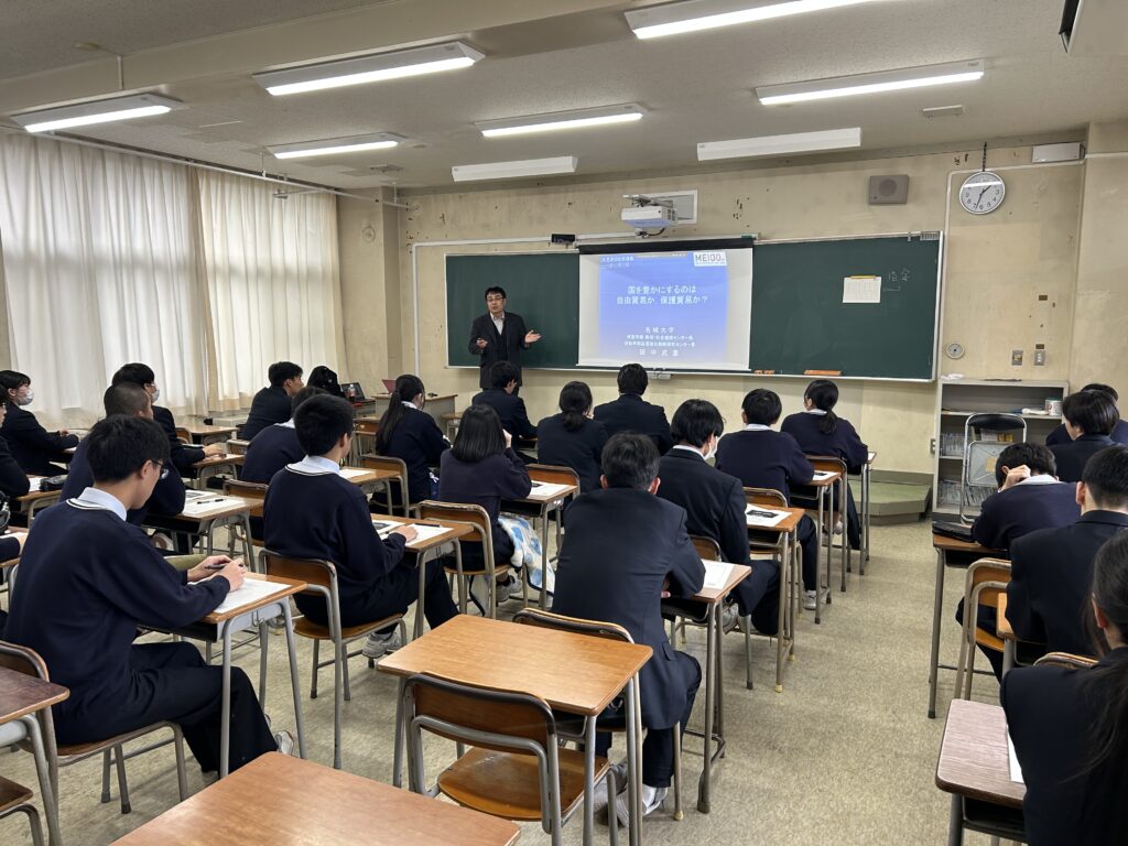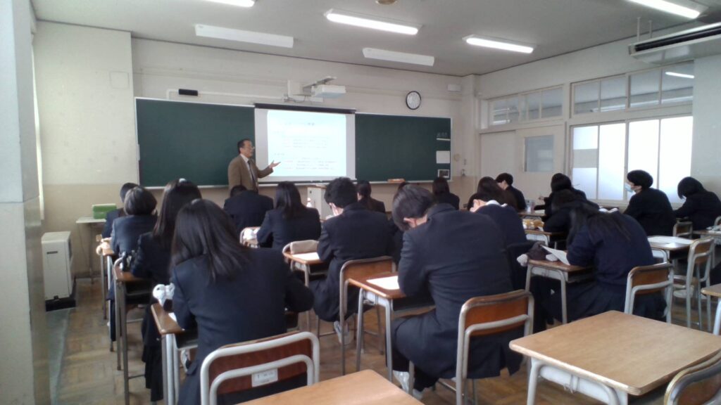 12月12日(金)、愛知県名古屋市にある名城大学の経営学部、農学部、都市情報学部から5名の先生に来校いただき、研究内容や大学の様子などについて講義をしていただきました。1・2年生の希望者135名が参加しました。 受講した生徒からは「日本の働き方や働かせ方が世界と違うことを知り面白かった。仕事で何を重視されているか、自分に何ができるかを考えて行動することが大切だと気づいた。AIに負けないよう頑張っていきたい」「VR技術の発達を知ることができた。実際にVRの模型を作って体験ができて面白かった。『VRは旅行の代わりになるのか』という質問はとても考えさせられた。」等の感想があり、自分のことについて考え、大学での学びが社会に深く関わっていることを知る良い機会となったようです。