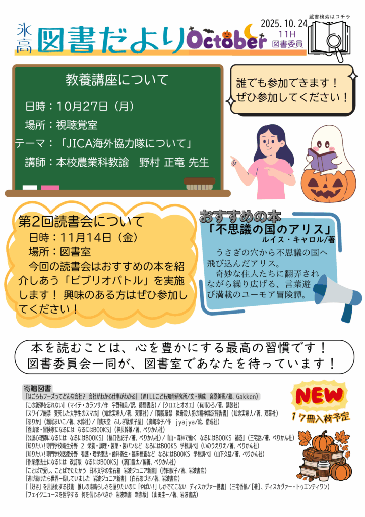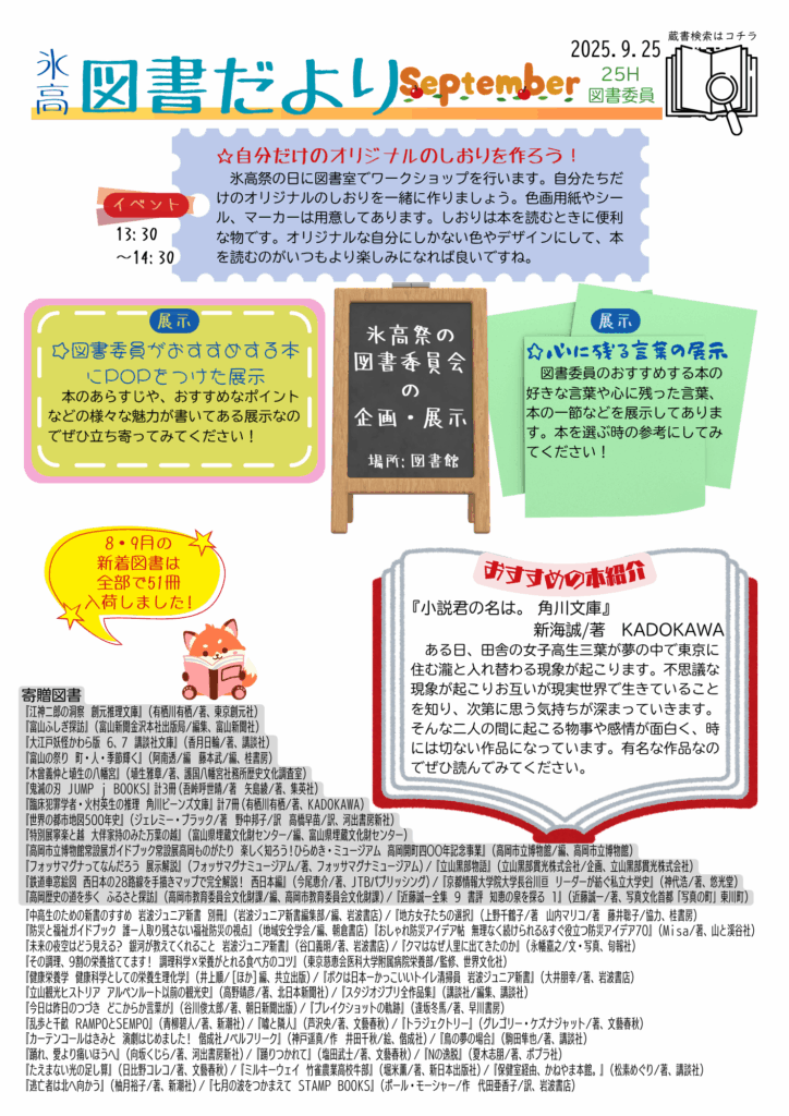 9月号は25H、10月号は11Hの図書委員がCanvaを使って作成しました。