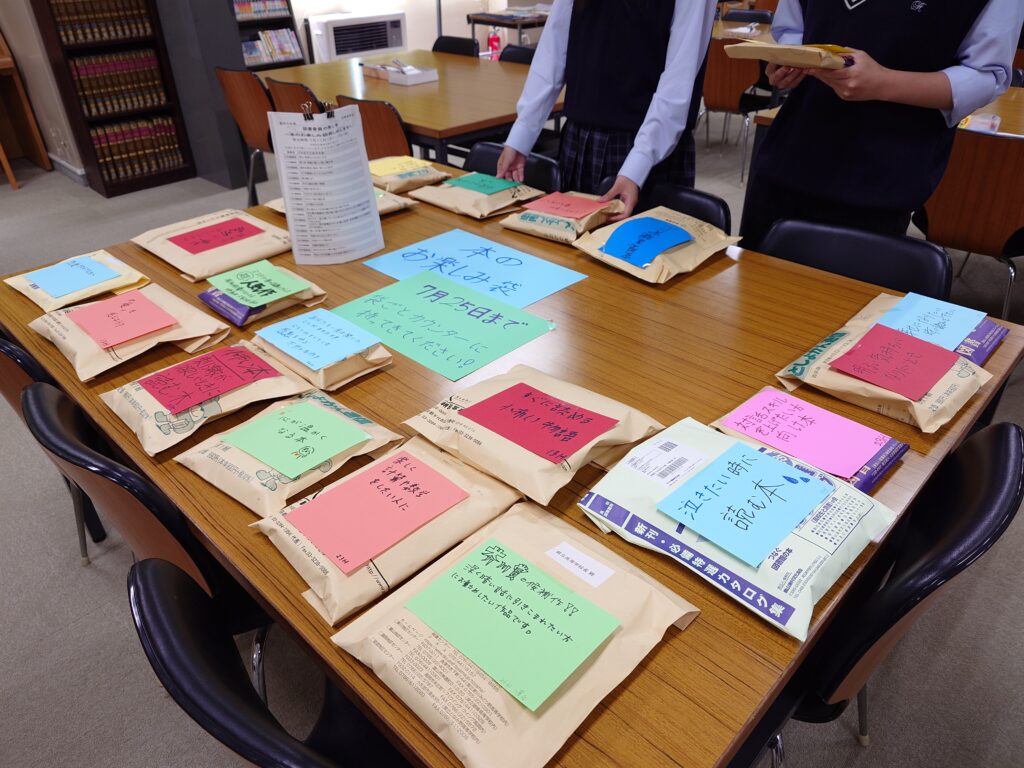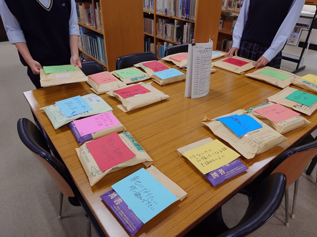下段は夏休み前に行った「本のお楽しみ袋」です。袋の中に2冊、「明るい気持ちになりたいときに読む本」「刺激が欲しいときに読む本」など、図書委員が自ら選んだテーマに沿った本が入っていました。