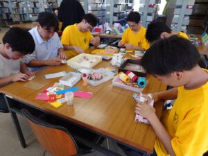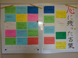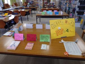 上段は9月27日(土)に行われた氷高祭での図書委員による「図書委員がおすすめする本」のPOPと「心に残った言葉」の展示、「しおり作り」のワークショップです。
