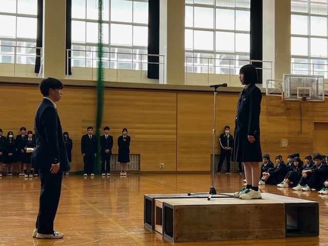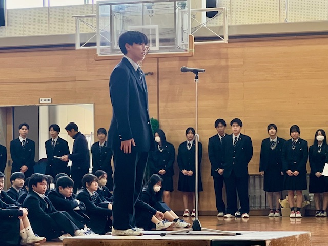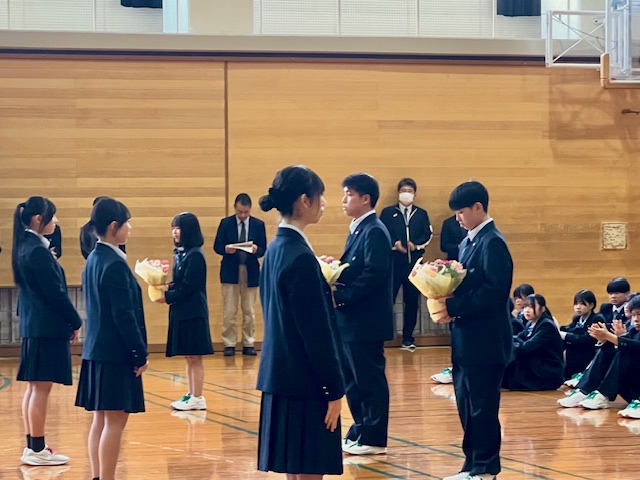 宮澤生徒会長が歓迎挨拶を行い、新入生を代表して野手葵さんが代表挨拶をしました。最後に生徒会執行部から各クラスの代表へ花鉢を贈呈しました。
