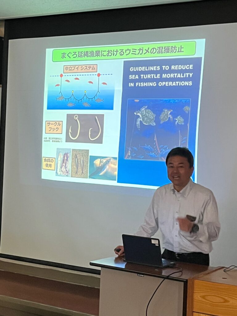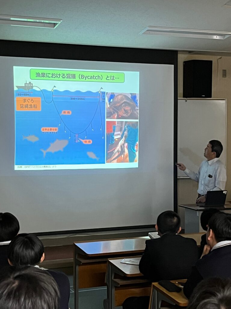 当日は、先生が東京海洋大学で研究している、「漁業における混獲問題に関する研究」について講義をしていただきました。延縄漁業においてウミガメや海鳥などが混獲されてしまう問題に対して、現状の取り組みや研究していることについて、分かりやすく教えていただきました。生徒たちは、興味深くお話を聞き、漁業において漁獲物以外の生き物への配慮の必要性について理解することができたようです。