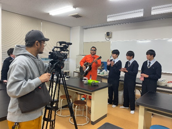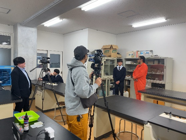 10月29日(水)、海洋科学科3年生の生徒3名が、チューリップテレビ放送の番組企画「寅さんのものづくり応援団」で取材を受けました。 当日はキトキトロックミュージシャンこと寅さんに課題研究「海洋ゴミの有効活用」における取り組みを紹介しました。取材内容は11月9日(日)、11月23日(日)の2日間に渡って放送される予定です。ぜひご覧ください。