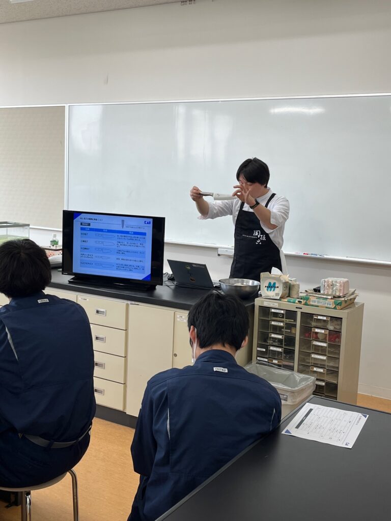 当日は、包丁マイスターの方から、普段私たちが身近に使っている包丁の知識や扱い方について教わりました。実際に包丁の研ぎ方を教わるだけではなく、包丁の仕組みやメンテナンスについても教わることができました。今後、缶詰やレトルトパックといった商品を作るだけではなく、商品作りに関わりのある器具等についても関心を深めていきたいと感じました。