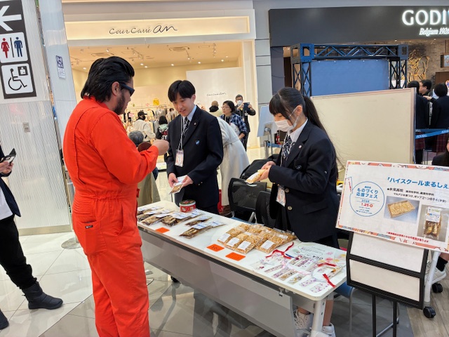 また、「ハイスクールまるしぇ」では農業科学科が作成したポップコーンの種と花びらで作ったしおりと、海洋科学科が未利用魚を有効活用したレトルトパックを販売させていただきました。生徒たちにとっても、直接購入していただいたお客様と会話ができるよい体験になりました。ご来場いただいた皆様、誠にありがとうございました。