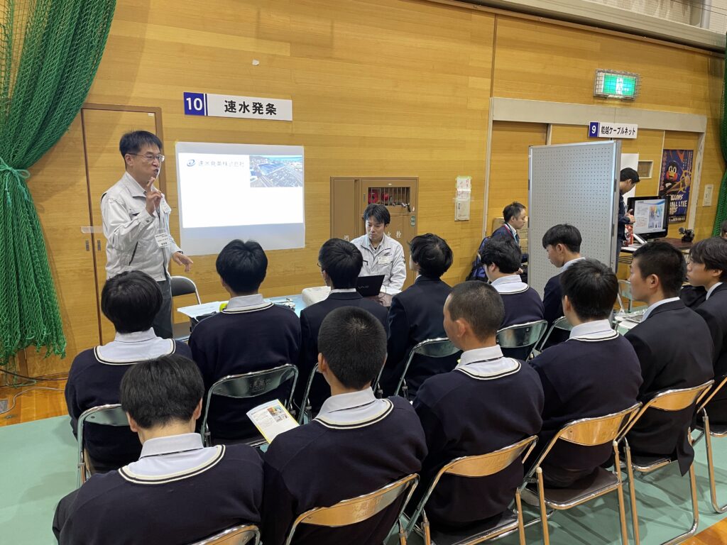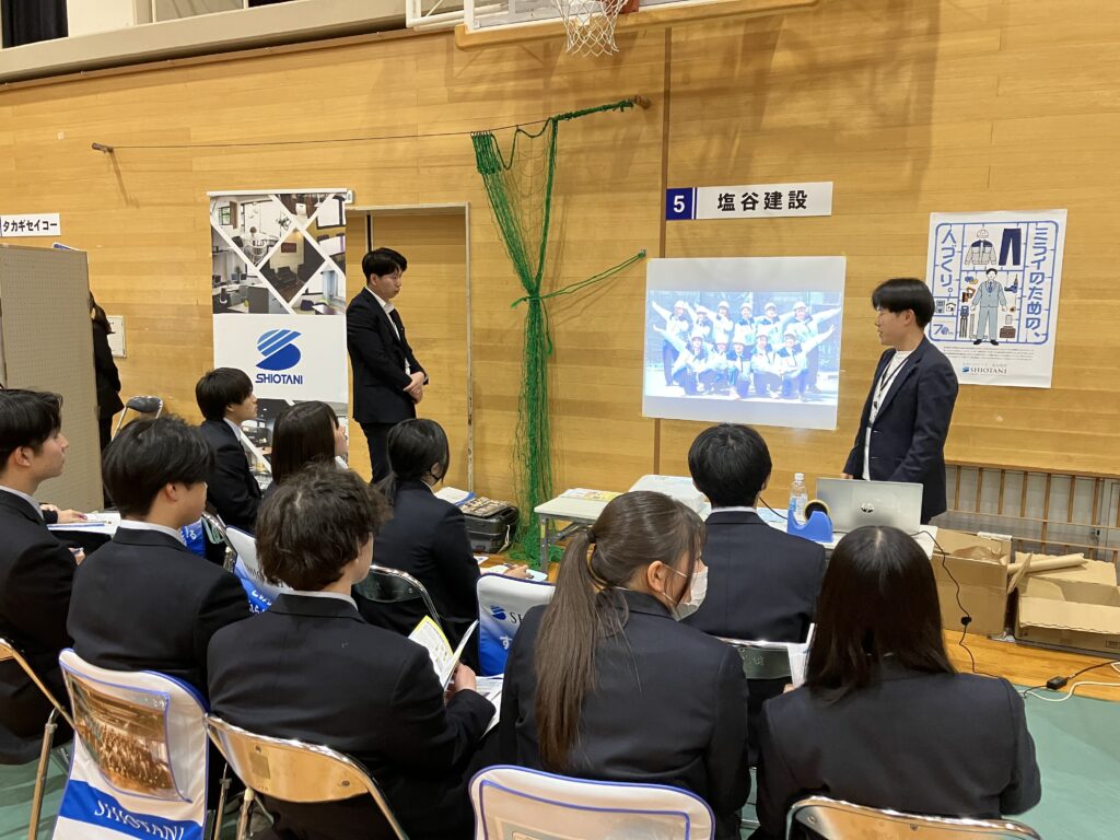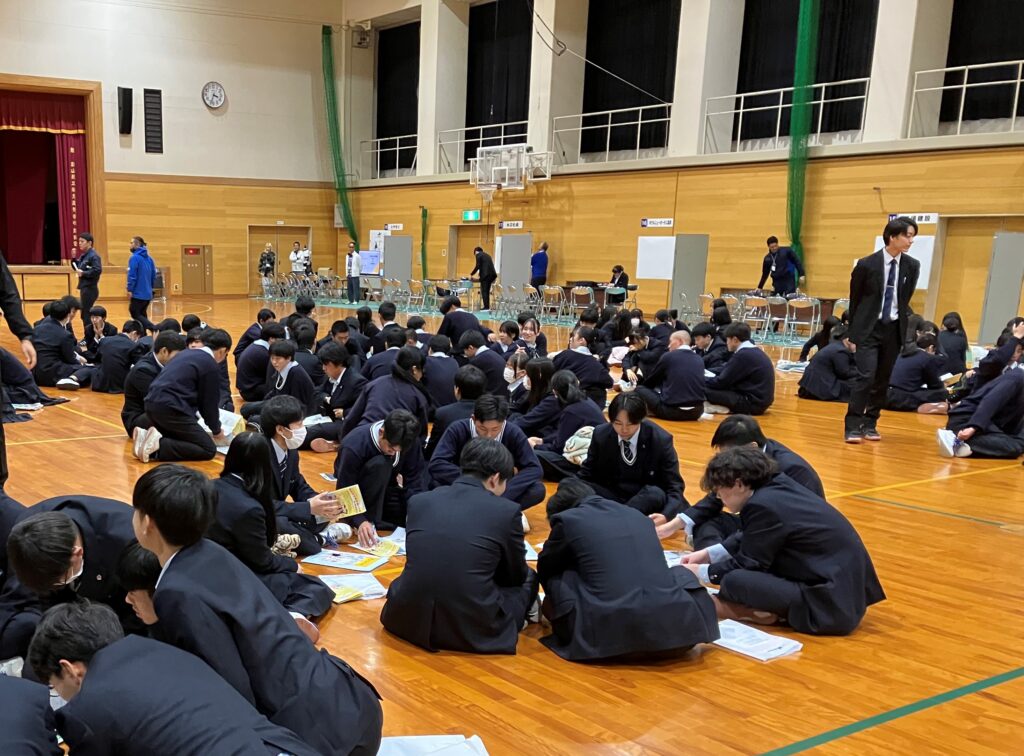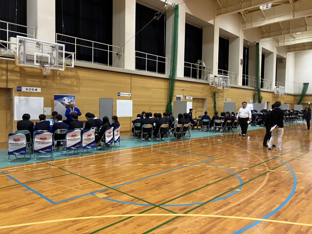 18社の企業に参加いただき、生徒は企業ブースを7社まわってプレゼンを聞き、生徒が企業のプレゼンを評価する形をとりました。グループでプレゼン優秀企業3社を選び、「笑顔で聞きやすく、スライドも見やすかった」「身近な商品や知っているブランドが出てきて親近感がわいた」「北陸で売り上げが一番と知って驚いた」「環境に優しい取り組みが行われていた」などの理由を発表しました。生徒は、企業のみなさまの説明を聞き、自らについて考え、学習に励むなど、高校生活を充実させるための大切なものを感じたようでした。